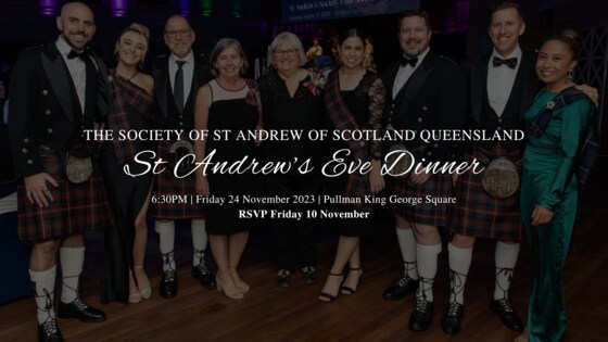 76th St Andrew's Day Dinner  Guest Speaker: The Honourable Justice Glenn Martin AM, Senior Judge Administrator of the Supreme Court of Queensland Pre-dinner drinks from 6.45pm PLEASE BE SEATED BY 7.30PM SHARP Dress: Formal, including Scottish and Military formal styles Full details of your party can be entered during the ordering process on this website. Entry will be by name card available at the door.  RSVP Monday 17 November with names and payment If you wish to attend but ticket sales have ended, please email treasurer@standrewsociety.com to see if a booking can still be made! If you would prefer to use the paper invitation form, please click on this link.  Presentation of Younger Clansmen and Clanswomen  Members are invited to take advantage of the evening to nominate younger relatives or friends who intend to join the Society for presentation as a Younger Clansman and Clanswomen. Indicate by checking the box against their name as you go through the order process - you will be contacted with further details before the dinner.  Table Sponsors  Sponsors will be acknowledged:  on the Society website and Facebook page on the menu  on the table  names displayed and acknowledged on the night.  Here is an opportunity for your firm, business, clan, or family to formally support the Society. Price is $300 per table. Please purchase your table sponsorship through the order process.  Pipers and Drummers  Musicians attending the dinner are invited to bring along their instruments for the Pipers' Parade. Please check the box next to name(s) on your order who wish to participate.  Generational Members  The Society is proud and indeed privileged to acknowledge the kind support of members across the generations. Please use the drop-down boxes provided if more than two generations of one family in your party are attending the dinner.