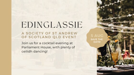 Two course meal and dancing and entertainment from Ishka Celtic Band. Bring your friends and family for a great Scottish night in the exclsive atmosphere of Queensland's Parliament House. Buy tickets in groups if that suits you.  Tables of 10 are available. RSVP:   Sales still open till 29 June Payment by credit/debit card is available through this page.  If you wish to pay by direct debit or cheque, please email your order details to treasurer@standrewsociety.com and we will send you payment details. For those not in the know "Edinglassie" was the name originally proposed for Brisbane.